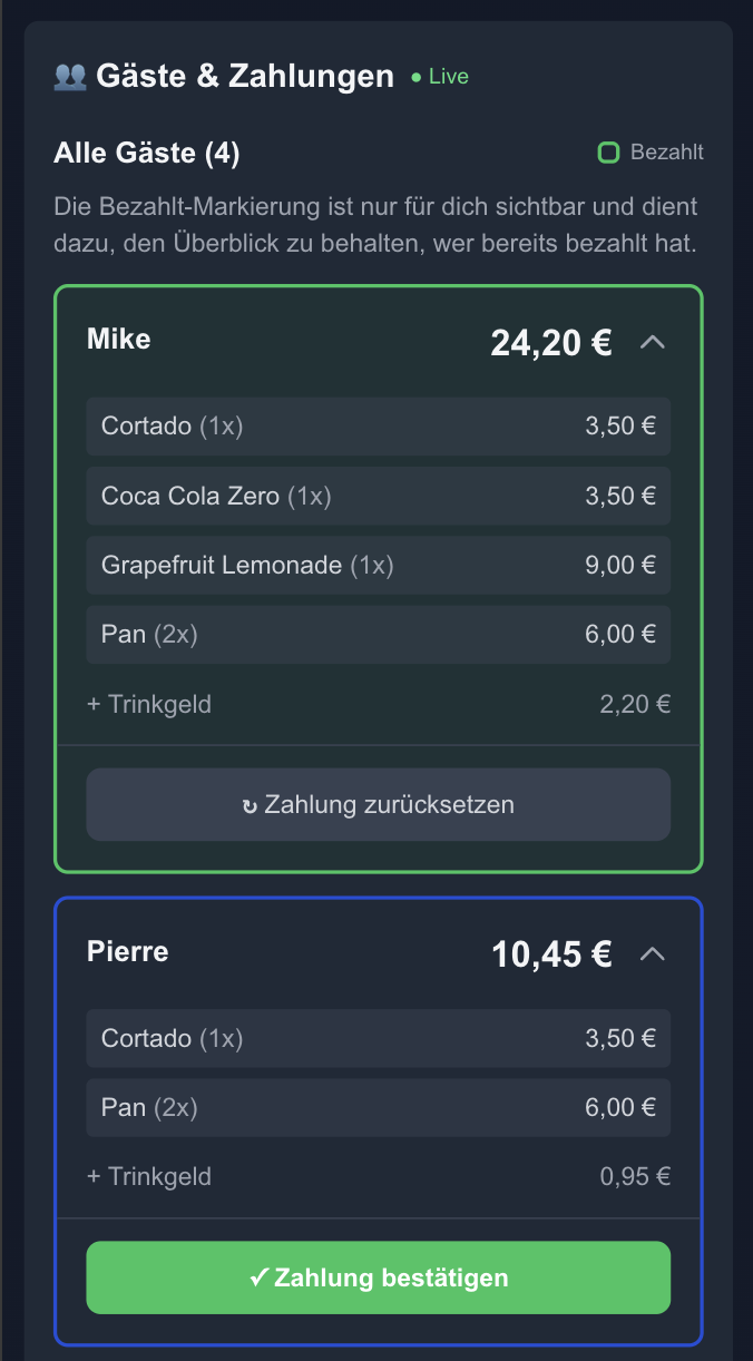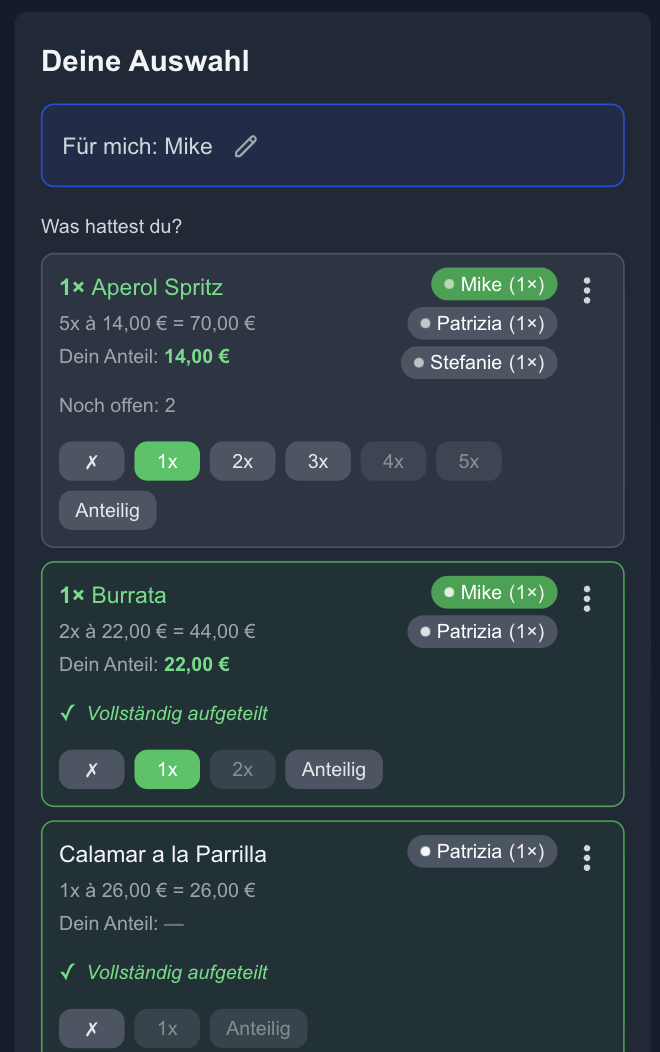 - Jeder sieht die komplette Rechnung und kann sofort auswählen was er hatte